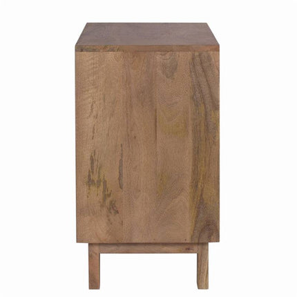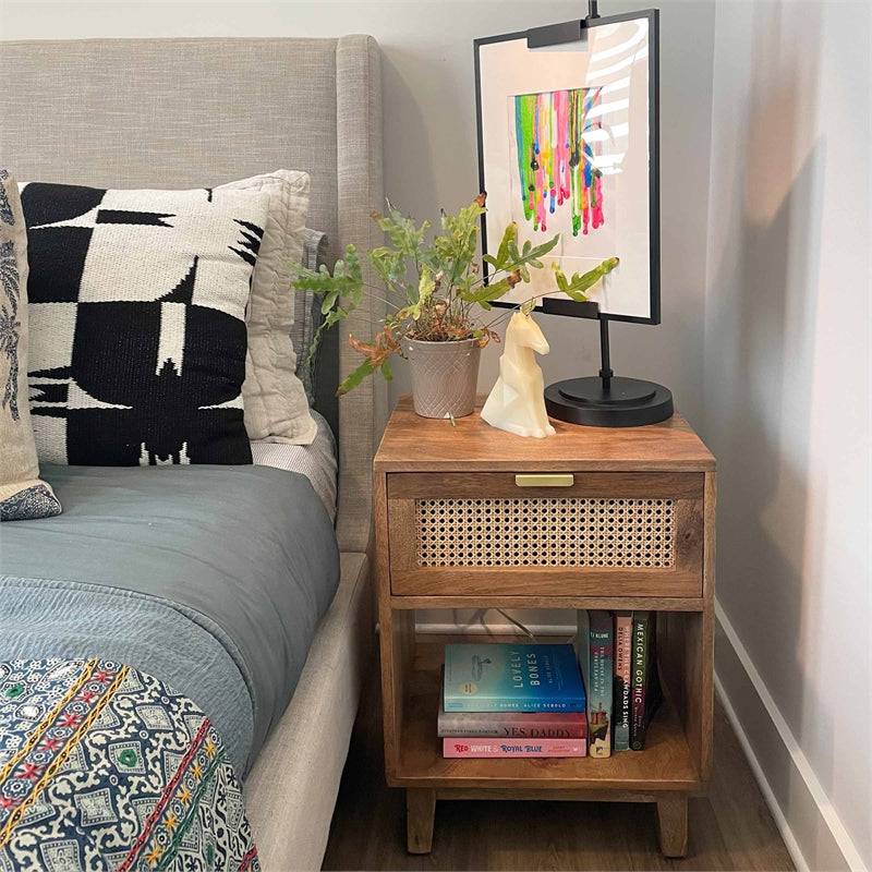 - Multi Storage options: Drawer with woven cane insert panel details and open shelf.